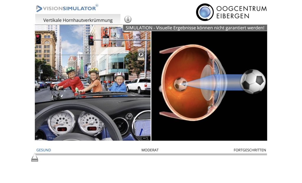 Bei einer Hornhautverkrümmung auch Stabsichtigkeit wird ein Kreis in der Bildebene verzerrt und als ovaler Kreis auf der Netzhaut abgebildet. Ursache ist eine ungleichmäßige Wölbung der Hornhaut. Normalerweise hat die Hornhaut eine gleichmäßige Wölbung der Oberfläche, wie die Oberfläche einer Kugel aus Glas. Bei einer Hornhautverkrümmung entstehen unterschiedliche Wölbungen ähnlich der Oberfläche eines Glasei. Einfallende Lichtstrahlen werden im dreidimensionalen Oval unregelmäßig gebrochen, so dass es zu Verzerrungen kommt. Es werden die vom betrachteten Objekt ausgehenden Lichtstrahlen nicht in einem Punkt auf der Netzhaut gebündelt, sondern in einer Brennlinie abgebildet. Spezielle Brillengläser oder Kontaktlinsen können diese Fehler ausgleichen, so dass wieder ein normales Bild der Realität abgebildet wird.